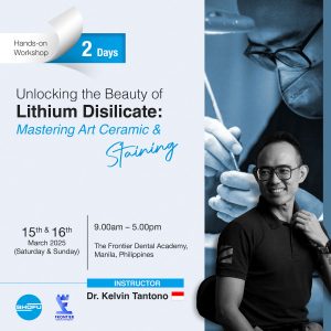 Date: 15-16 March 2025 Time : 9am – 5:00pm Venue: The Frontier Dental Academy, Manila, Philippines Course Objective Delve into the techniques of using ceramic and stain to enhance the natural beauty of lithium disilicate restorations, focusing on how to replicate the subtle colour gradients, translucency, and texture found in natural teeth. By understanding the […]