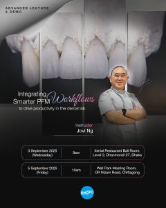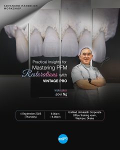 Date: 3 September 2025 Time: 9am Venue: Xenial Restaurant Ball Room,Level-2, Dhanmondi-27, Dhaka Date: 5 September 2025 Time: 10am Venue: Well Park Meeting Room, OR Nizam Road, Chittagong Synopsis: Porcelain fused to metal (PFM) restorations have a long track record and are still routinely prescribed due to their reliability, longevity and cost benefits to […]